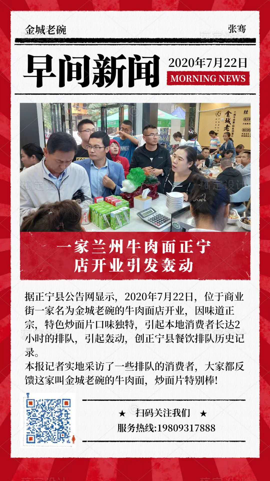 本報(bào)記者現(xiàn)場(chǎng)報(bào)道:2020年7月22日位于本縣商業(yè)街的一家名為“金城老碗”牛肉面,特色炒面片的餐飲店開業(yè),因口味獨(dú)特,味道正宗,導(dǎo)致消費(fèi)者排隊(duì)長(zhǎng)達(dá)2小時(shí),創(chuàng)下正寧縣餐飲排隊(duì)歷史新高。