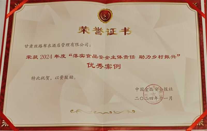 在2024年11月3日盛大舉行的第十一屆全國(guó)食品安全監(jiān)管信息工作交流大會(huì)上,甘肅絲路布衣酒店管理有限公司榮獲“2024年度落實(shí)食品安全主體責(zé)任 助力鄉(xiāng)村振興”杰出案例獎(jiǎng)。這一榮譽(yù)不僅是對(duì)公司在食品安全領(lǐng)域卓越貢獻(xiàn)的認(rèn)可,也是對(duì)其旗下餐飲連鎖店在食品安全管理方面卓越表現(xiàn)的肯定。